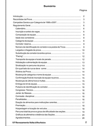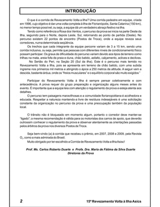 O documento descreve o regulamento e detalhes da 15a edição da prova de corrida de revezamento Volta à Ilha em Florianópolis. O percurso total é de 150km ao redor da ilha e conta com 22 pontos de troca. É destacado o trecho mais difícil no Sertão do Peri com subida íngreme e descida técnica. Também são listados os campeões gerais e por categoria das edições anteriores de 1996 a 2009.