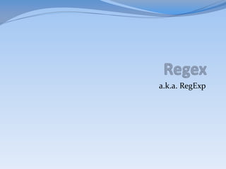O documento discute expressões regulares (regex), mencionando que: 1) Embora regex sejam aceitas por quase todas as bibliotecas, na verdade não são expressões regulares; 2) São difíceis de entender e fáceis de errar; 3) Apesar disso, são extremamente compactas.