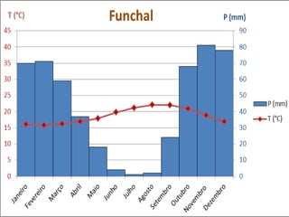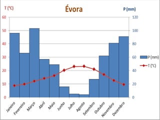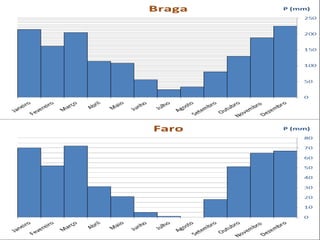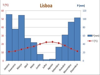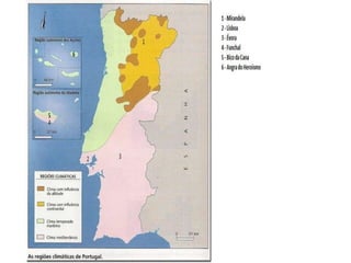O documento descreve as principais regiões climáticas de Portugal, incluindo o clima temperado marítimo, mediterrânico, de influência de altitude e continental. Fornece detalhes sobre as características de cada clima, como temperaturas, precipitação e gráficos termopluviométricos de diferentes locais.