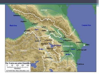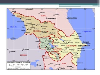 2) A Transcaucásia, com Geórgia, Armênia e Azerbaijão separados pelo Cáucaso e enfrentando conflitos étnicos.