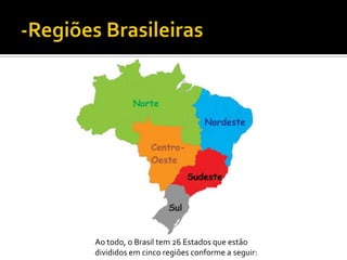 O documento descreve as cinco regiões do Brasil - Sul, Norte, Sudeste, Nordeste e Centro-Oeste - listando os estados que compõem cada uma e fornecendo breves detalhes sobre suas características.