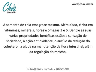 A semente de chia promove emagrecimento, é rica em nutrientes e possui diversos benefícios para a saúde. O documento recomenda o regime da semente de chia e oferece um kit composto por shake, chia a granel e cápsulas para auxiliar no consumo ao longo do dia.