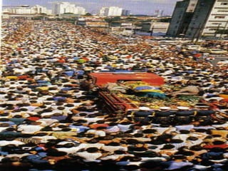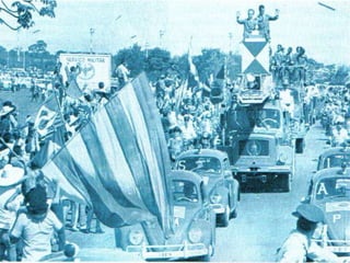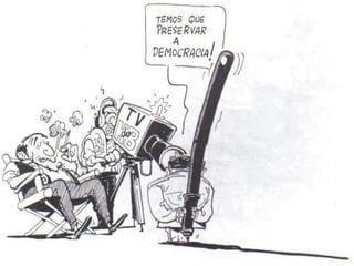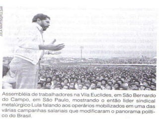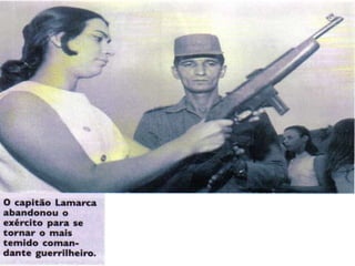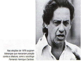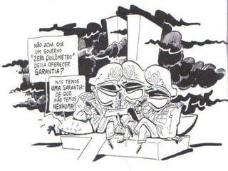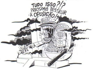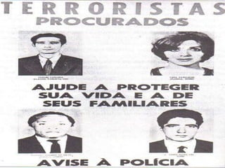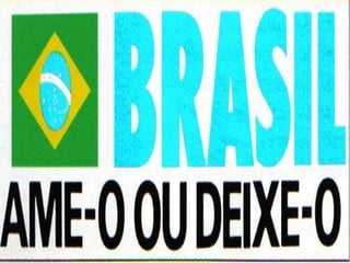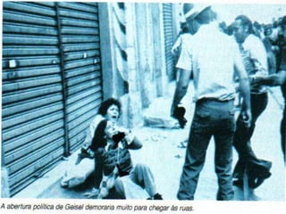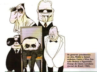 O documento descreve o regime militar no Brasil de 1964 a 1985. O período foi marcado pela repressão aos opositores do regime e pela presença de cinco generais como presidentes. Apesar da censura e violência, houve um momento de crescimento econômico entre 1967 e 1973, antes de uma crise e lenta abertura política durante os governos de Geisel e Figueiredo.