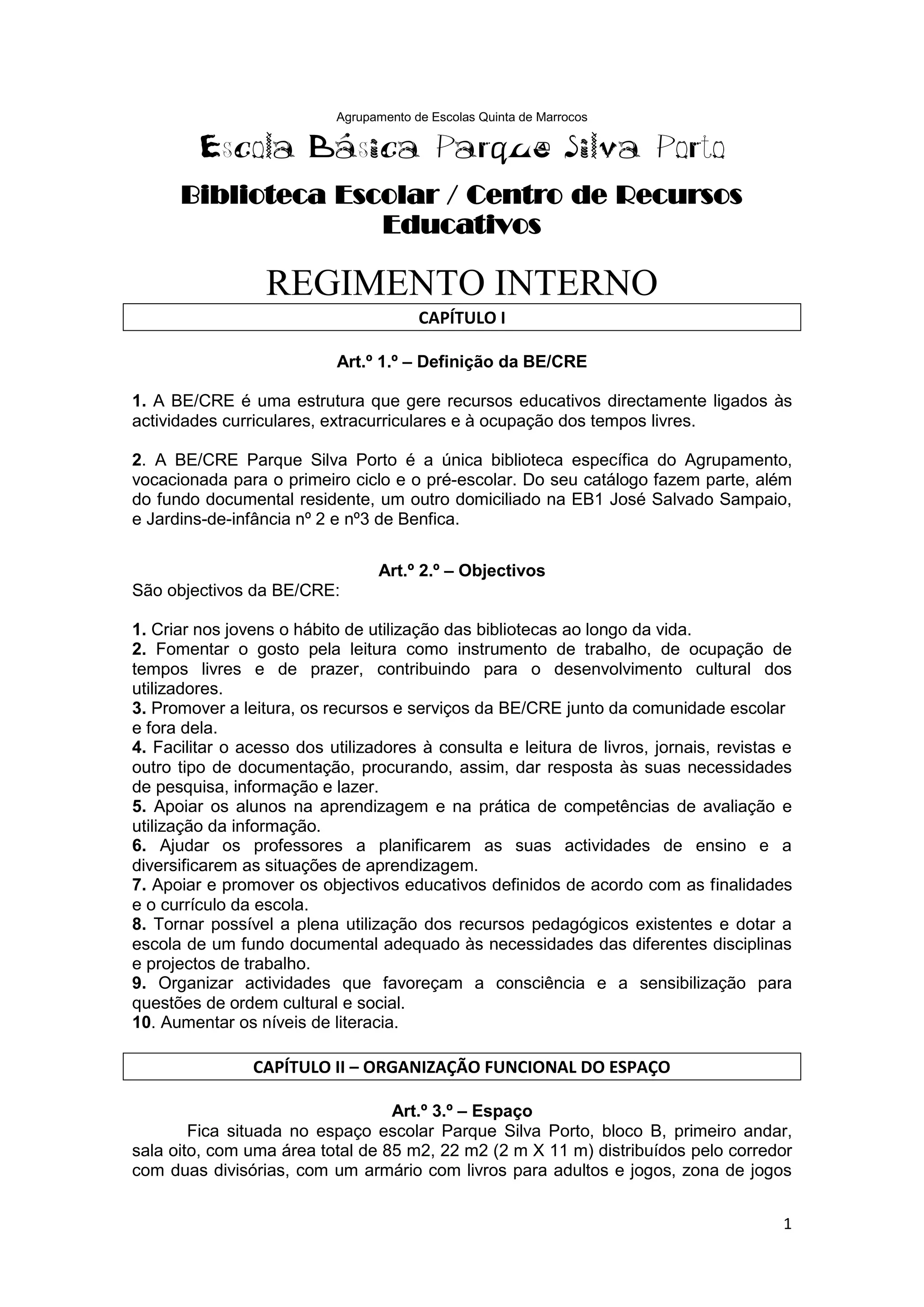 1) O documento descreve o regimento interno da Biblioteca Escolar/Centro de Recursos Educativos da Escola Básica Parque Silva Porto. 2) Inclui informações sobre objetivos, organização do espaço, horário, gestão de recursos humanos, organização e gestão documental, e utilização da biblioteca. 3) Tem como objetivo principal apoiar as atividades curriculares e promover o desenvolvimento de hábitos de leitura nos alunos.