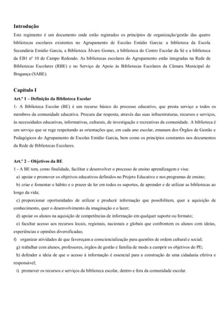 Este documento define as regras e objetivos das quatro bibliotecas escolares do Agrupamento de Escolas Emídio Garcia. Estabelece a organização dos espaços, horários de funcionamento, gestão dos recursos humanos e materiais, utilização pelos alunos e professores, e promove o acesso à informação para apoiar o processo educativo.