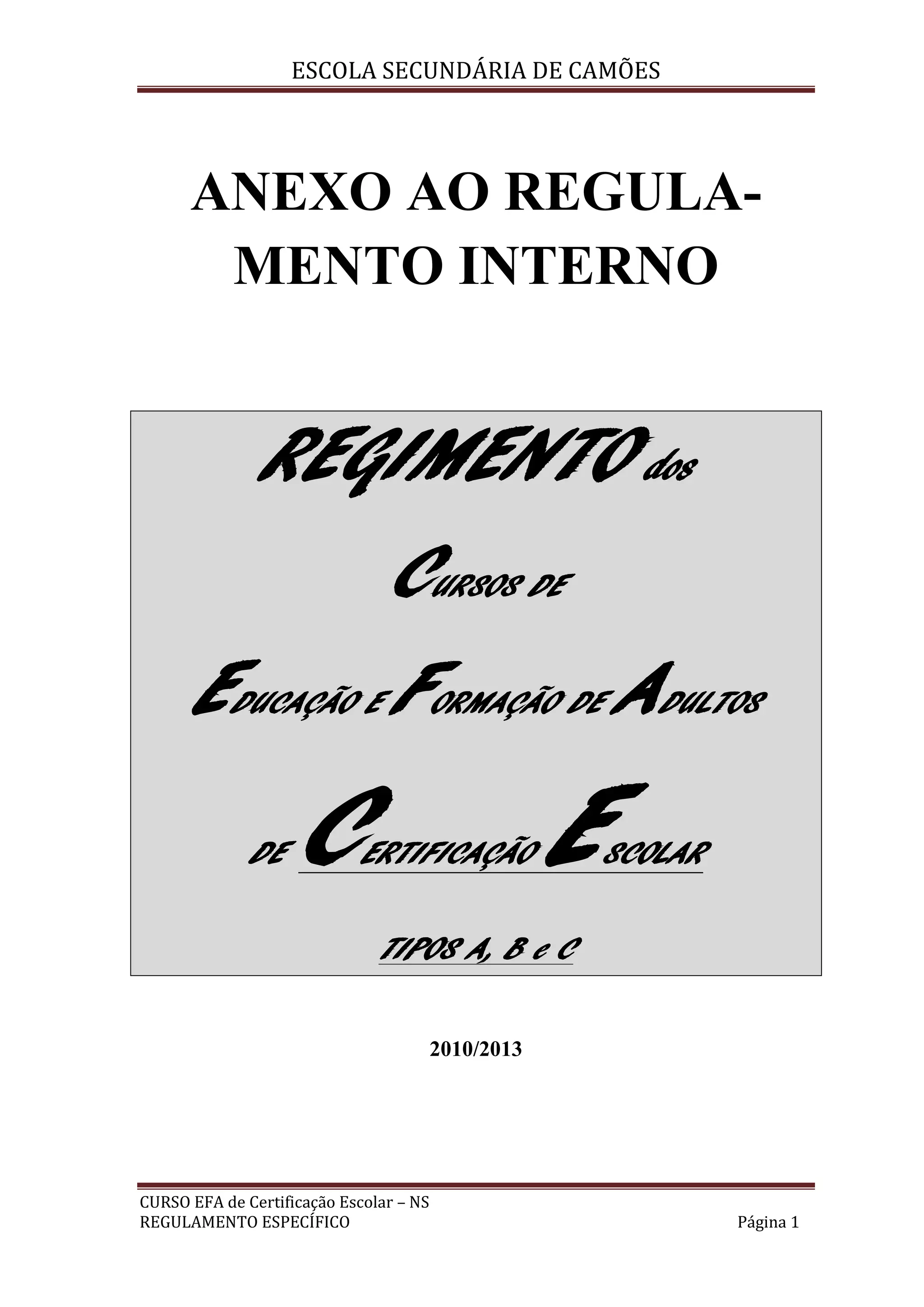 Este documento estabelece as diretrizes para os cursos de Educação e Formação de Adultos (EFA) de certificação escolar na Escola Secundária de Camões. Define a estrutura dos cursos, incluindo a equipe técnico-pedagógica, os perfis dos estudantes, os componentes de formação e carga horária. Também descreve os procedimentos de seleção, avaliação e assiduidade dos estudantes.
