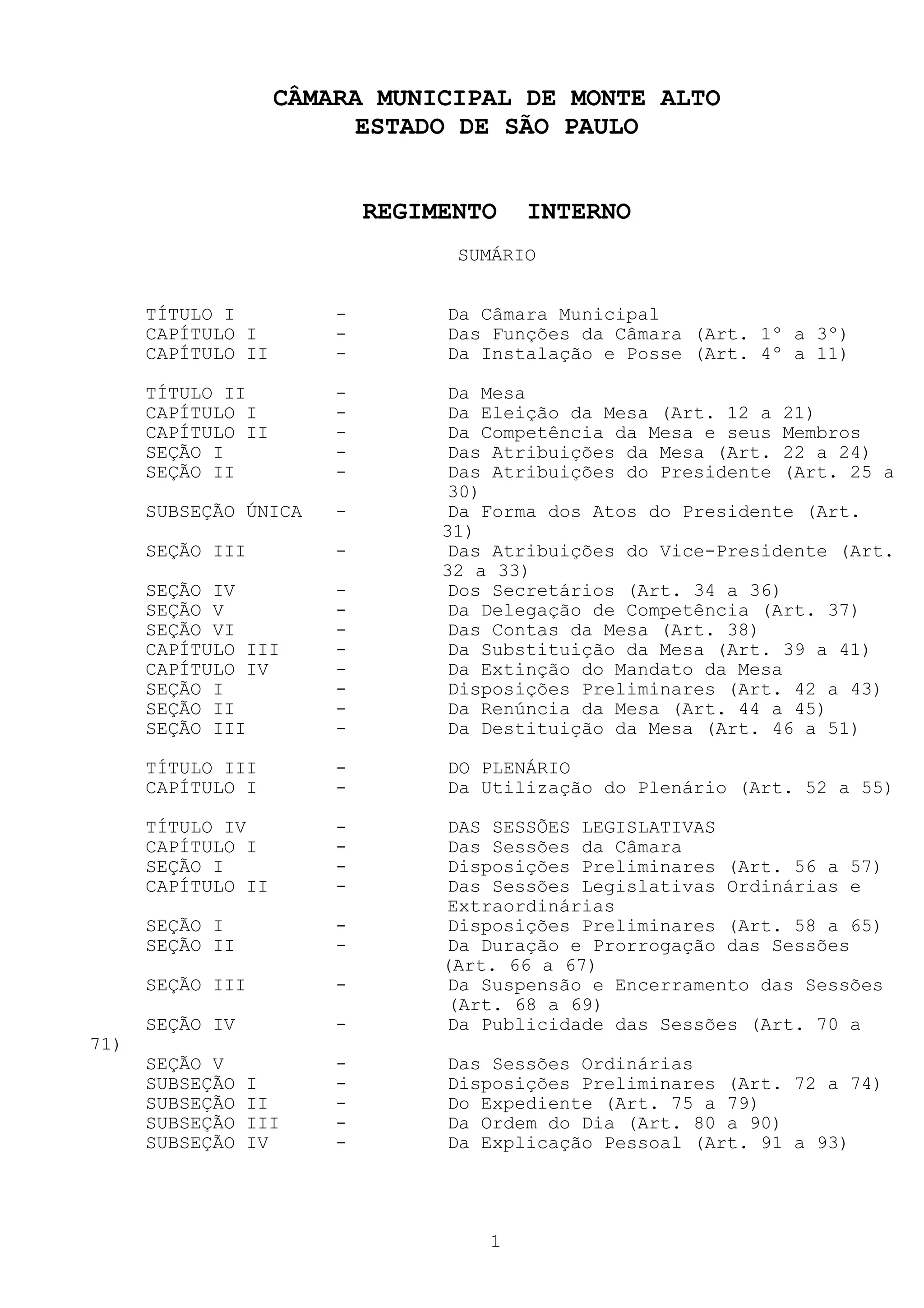 Este documento é o Regimento Interno da Câmara Municipal de Monte Alto, São Paulo. Ele estabelece as normas e procedimentos da Câmara em 12 títulos e 365 artigos, cobrindo tópicos como funções da Câmara, organização, sessões, comissões, proposições, processo legislativo, participação popular e direitos dos vereadores.