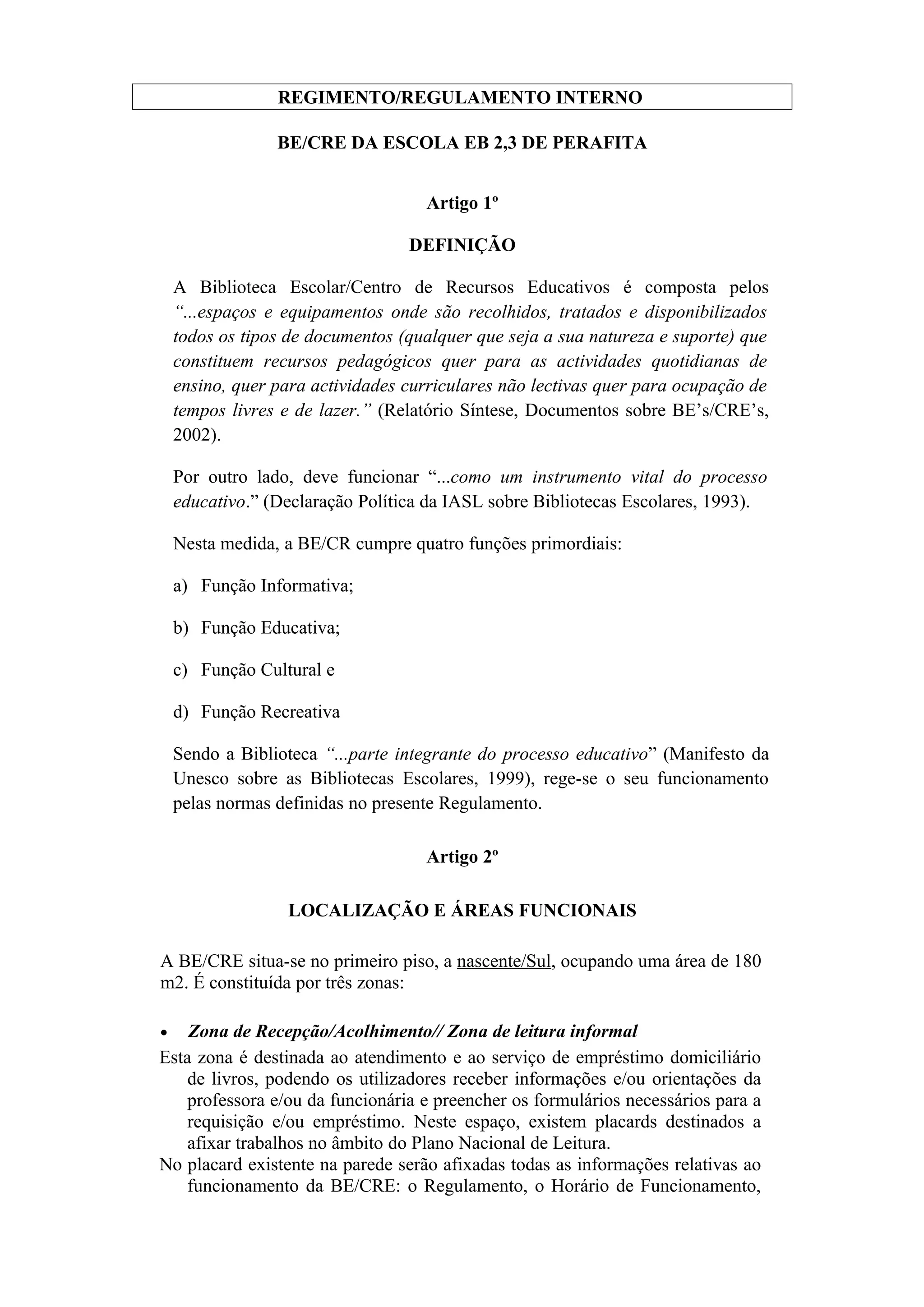 Este documento descreve o regulamento interno da biblioteca escolar/centro de recursos educativos da Escola EB 2,3 de Perafita. Define as funções, objetivos, equipa, organização e regras de utilização da biblioteca, incluindo o acesso aos recursos, direitos e deveres dos utilizadores.