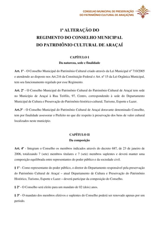 Este documento descreve as diretrizes e regulamentos do Conselho Municipal de Preservação do Patrimônio Cultural de Araçaí/MG. O Conselho foi criado para assessorar o prefeito na preservação dos bens culturais do município e é composto por representantes do poder público e da sociedade civil. O documento detalha a composição, atribuições, diretoria e processo de reuniões do Conselho.