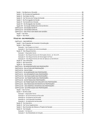 Este documento parece ser o Regimento Interno do Senado Federal. Ele estabelece as normas de funcionamento do Senado, tratando de assuntos como a sede, as sessões legislativas, os senadores, a mesa diretora, as comissões, as proposições legislativas e os processos de votação e deliberação. O documento está organizado em títulos e capítulos que descrevem em detalhes cada um desses aspectos do funcionamento da casa legislativa.