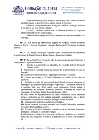 Este documento descreve o Regimento Interno da Fundação Cultural "Benedicto Siqueira e Silva" em Paraibuna, SP. Ele define os objetivos da fundação como promover a cultura e o patrimônio cultural do município. Também estabelece seus órgãos administrativos principais como a Diretoria Executiva, o Conselho Deliberativo e as Comissões Setoriais, e define as atribuições do Diretor Presidente, Diretor Cultural e Diretor Administrativo.
