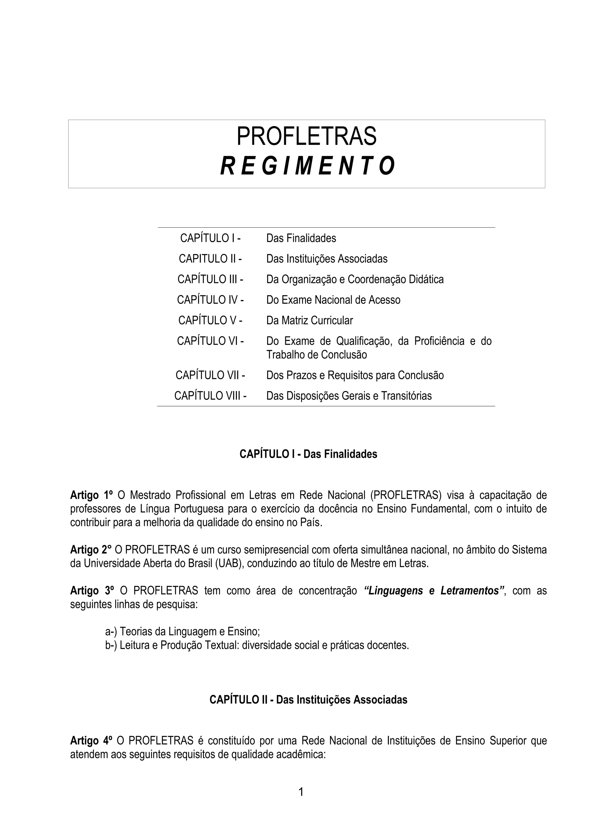 Este documento apresenta o regimento do Mestrado Profissional em Letras em Rede Nacional (PROFLETRAS), com o objetivo de capacitar professores de Língua Portuguesa para o Ensino Fundamental. O curso é semipresencial e oferecido por uma rede de instituições de ensino superior. O regimento define a estrutura do programa, requisitos para ingresso e conclusão, disciplinas obrigatórias e optativas, exames de qualificação e proficiência, além de instâncias como Conselho Superior, Conselho Gestor e Colegiados