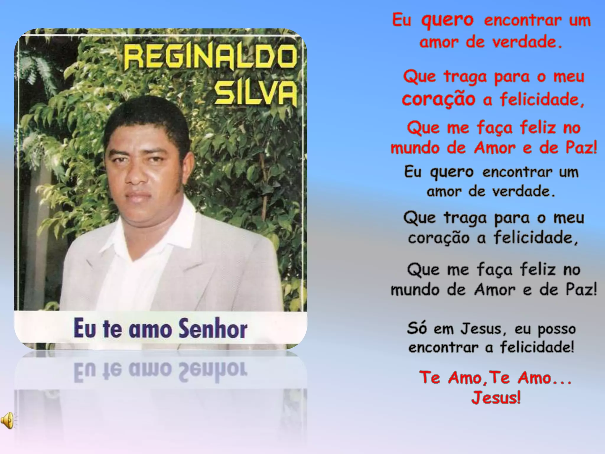 Euqueroencontrar um amorde verdade. Que traga para o meu coração a felicidade,Que me faça feliz no mundo de Amor e de Paz!Reginaldo SilvaEuqueroencontrar um amor de verdade. Que traga para o meu coração a felicidade,Que me faça feliz no mundo de Amor e de Paz!Só em Jesus, eu posso encontrar a felicidade!Te Amo,Te Amo...Jesus!