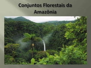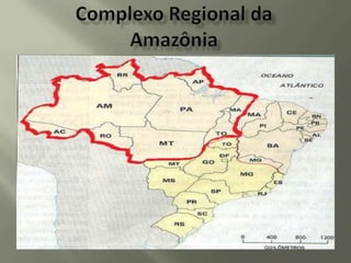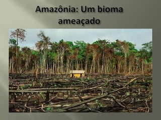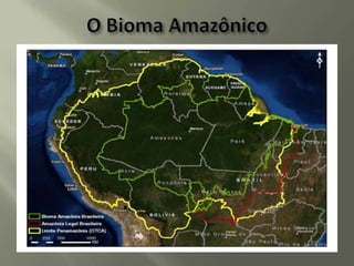Este documento descreve a região amazônica no Brasil. A Amazônia é a maior região do Brasil, abrangendo a maior parte dos estados do Norte e partes de outros estados. Possui a maior biodiversidade do mundo e é lar de milhares de espécies de plantas, animais e microrganismos. A região sofre ameaças como desmatamento e exploração inadequada dos recursos naturais.