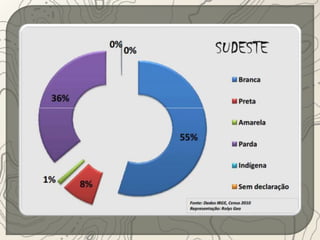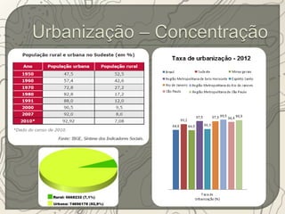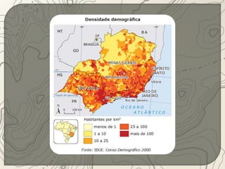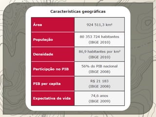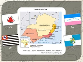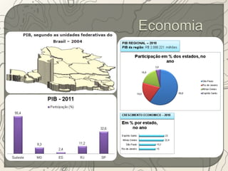 O documento descreve a região Sudeste do Brasil. A região está localizada na parte mais elevada do Planalto Atlântico, onde se encontram as serras do Espinhaço, da Mantiqueira e do Mar. O Sudeste possui uma história de colonização européia desde o século XVI e teve sua economia baseada no café por muitos anos. Atualmente, a região é a mais industrializada e urbanizada do Brasil.
