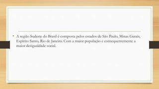 A região Sudeste do Brasil é composta por quatro estados e possui a maior população e economia do país. Sua economia diversificada se desenvolveu a partir da agricultura de café e da industrialização no século XX. A região contém grandes centros urbanos, desigualdade social, relevo variado e vegetação original de Mata Atlântica.