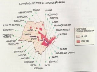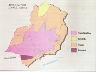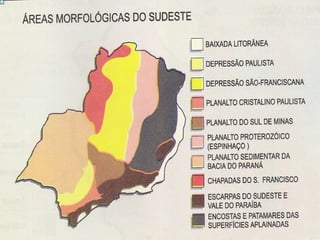 O documento descreve os aspectos físicos e econômicos da Região Sudeste do Brasil. A região possui relevo formado principalmente por planaltos e serras, com bacias hidrográficas importantes. Sua economia é muito diversificada e baseia-se na agricultura, pecuária, indústria, energia e turismo. A cidade de São Paulo se destaca como o maior centro financeiro, industrial e populacional do país.