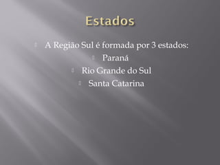 A Região Sul do Brasil é formada pelos estados de Paraná, Rio Grande do Sul e Santa Catarina, com as capitais Curitiba, Porto Alegre e Florianópolis respectivamente, e populações de mais de 10 milhões, 10 milhões e 6 milhões cada. Os estados variam em tamanho de quase 100 mil a quase 300 mil quilômetros quadrados.