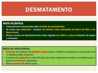 O documento discute os problemas ambientais e a economia da Região Sul do Brasil. A Mata Atlântica e a Mata de Araucárias sofreram intensos desmatamentos que deixaram apenas pequenas porções remanescentes, enquanto a arenização ameaça o solo da Campanha Gaúcha. A extração de carvão mineral polui recursos hídricos em Santa Catarina. A agricultura é predominantemente familiar e a pecuária é favorecida pelas pastagens nativas.