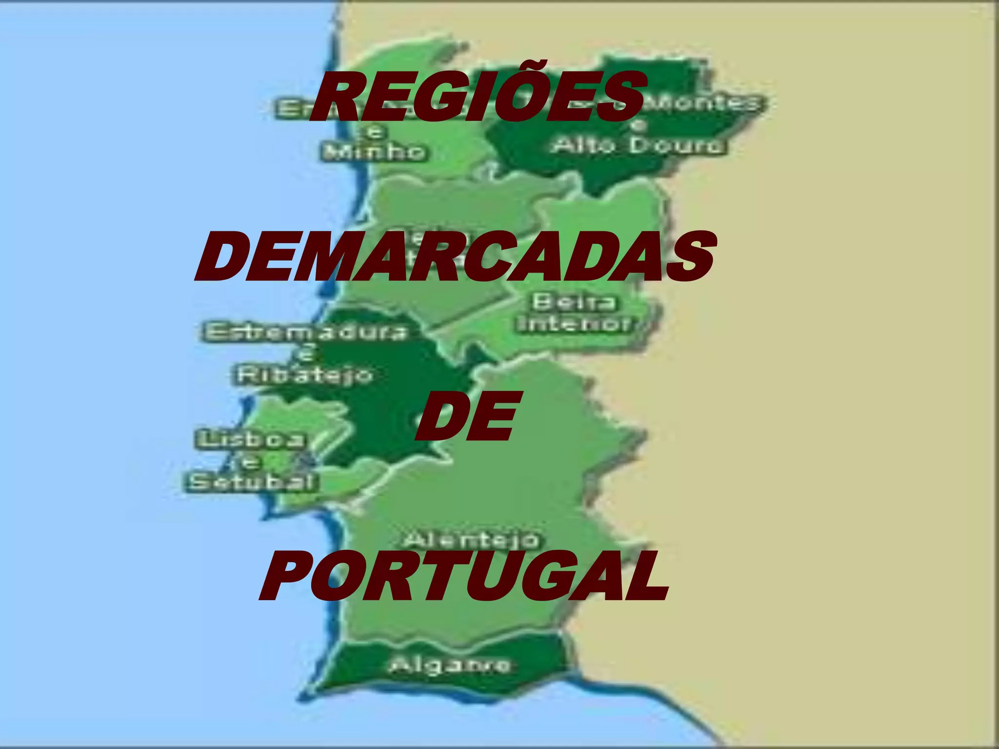 Este documento descreve quatro regiões demarcadas portuguesas para a produção de vinho, incluindo a Região Demarcada do Douro, a Região Demarcada dos Vinhos Verdes, a Região Demarcada da Bairrada e a Região Demarcada do Alentejo. Cada uma destas regiões produz vinhos únicos com características de cor, aroma e sabor que refletem os solos e clima locais.