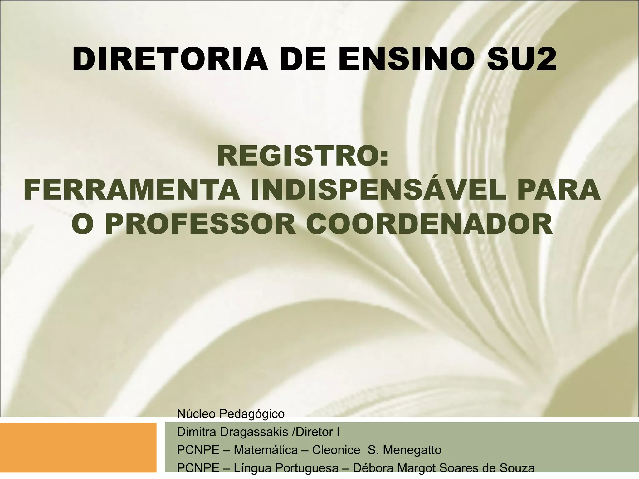 Este documento discute a importância do registro para professores e coordenadores. O registro permite planejar, analisar e melhorar a prática pedagógica, identificando avanços e dificuldades dos alunos. Diferentes tipos de registro são descritos, incluindo notas, pautas de observação, diários de aula e projetos didáticos. O registro promove a reflexão e o crescimento profissional contínuo.
