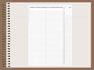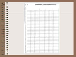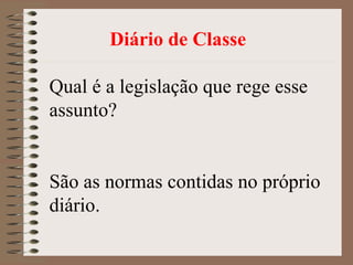 O documento fornece diretrizes sobre o preenchimento e uso do diário de classe pelos professores. Instrui os professores a registrar diariamente a ausência dos alunos, os conteúdos ministrados e as notas obtidas. Também instrui a direção e coordenação escolar a assinar e datar os diários periodicamente e arquivá-los ao final do ano letivo.