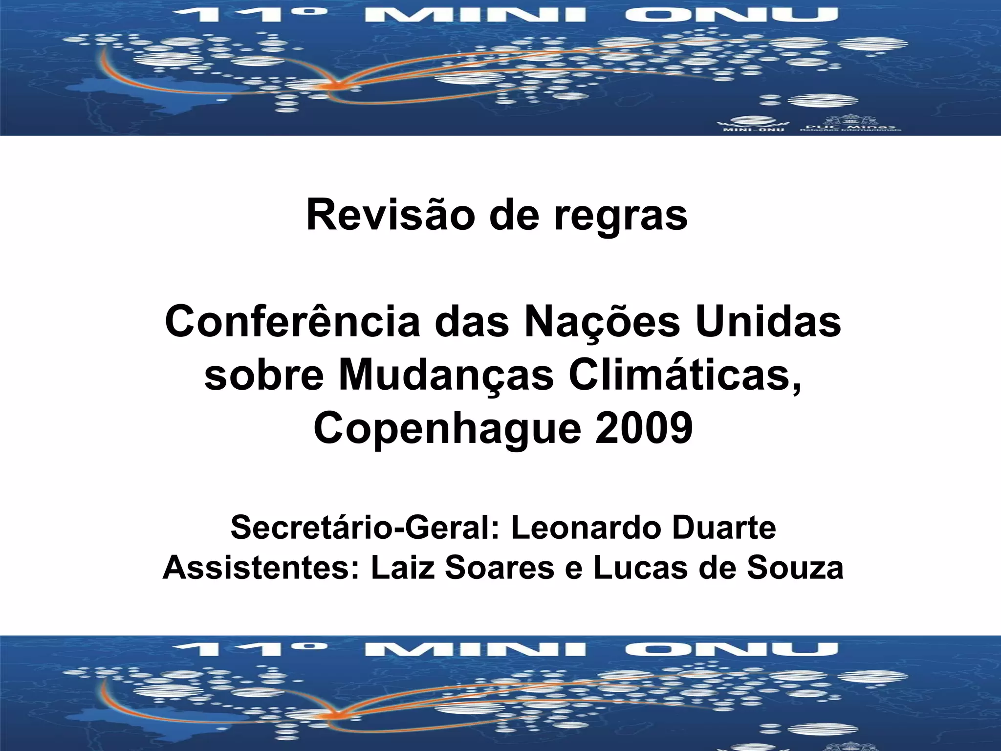 Este documento descreve as regras e procedimentos da Conferência das Nações Unidas sobre Mudanças Climáticas de 2009 em Copenhague. Ele detalha os deveres dos delegados, regras de debate, introdução e votação de propostas, e outras questões procedimentais da conferência.
