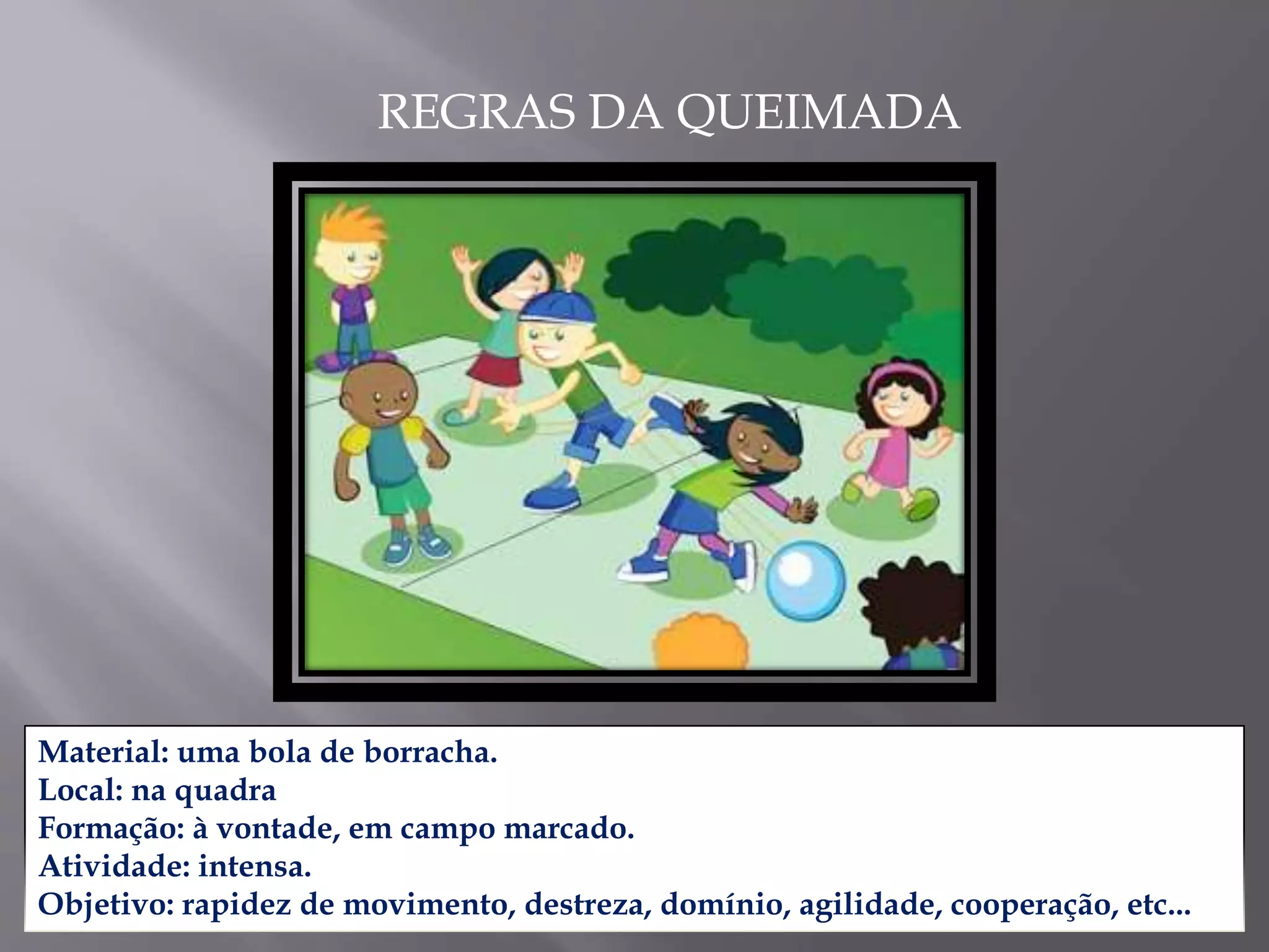 O documento descreve as regras do jogo de queimada, onde duas equipes competem para eliminar alunos adversários ao tocar a bola neles. Cada equipe tem 10 segundos para atacar, e pode marcar pontos mesmo com alunos no 'cemitério'. Existe penalização para troca de passes excessiva e pisar nas linhas durante o jogo.