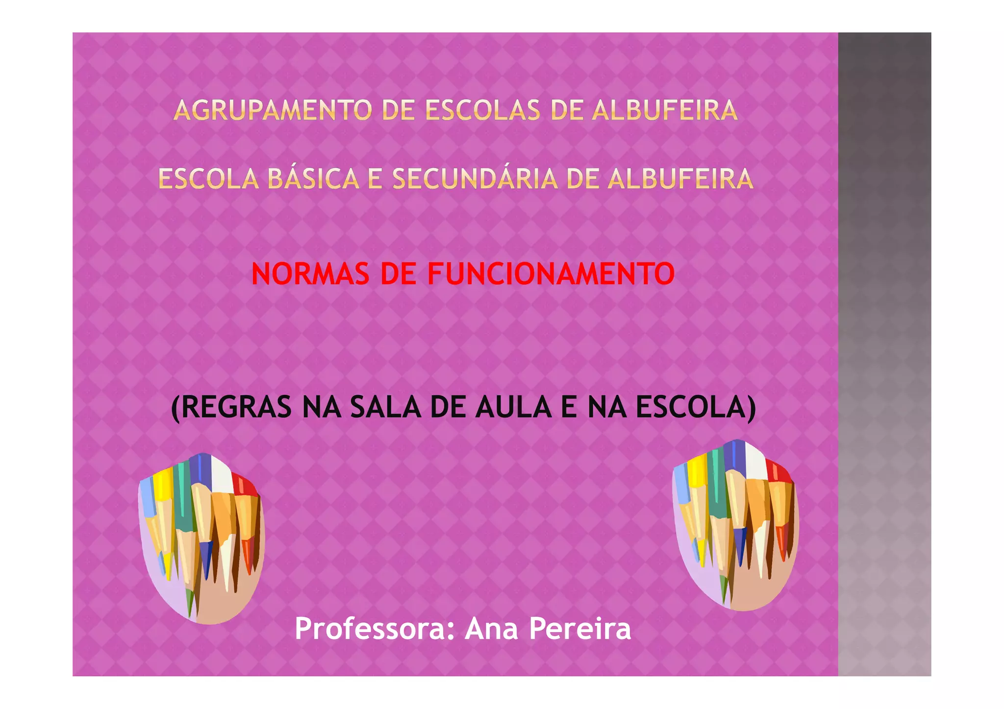Este documento apresenta as normas de funcionamento na sala de aula e na escola. Estas regras incluem a assiduidade, pontualidade, justificação de faltas, comportamento respeitoso, participação ativa nas aulas, cuidado com o material escolar, e proíbem comportamentos disruptivos como falar durante a aula ou usar linguagem imprópria. Os alunos devem concordar e assinar as regras no seu caderno para garantir um ano letivo harmonioso e o direito de todos à educação.