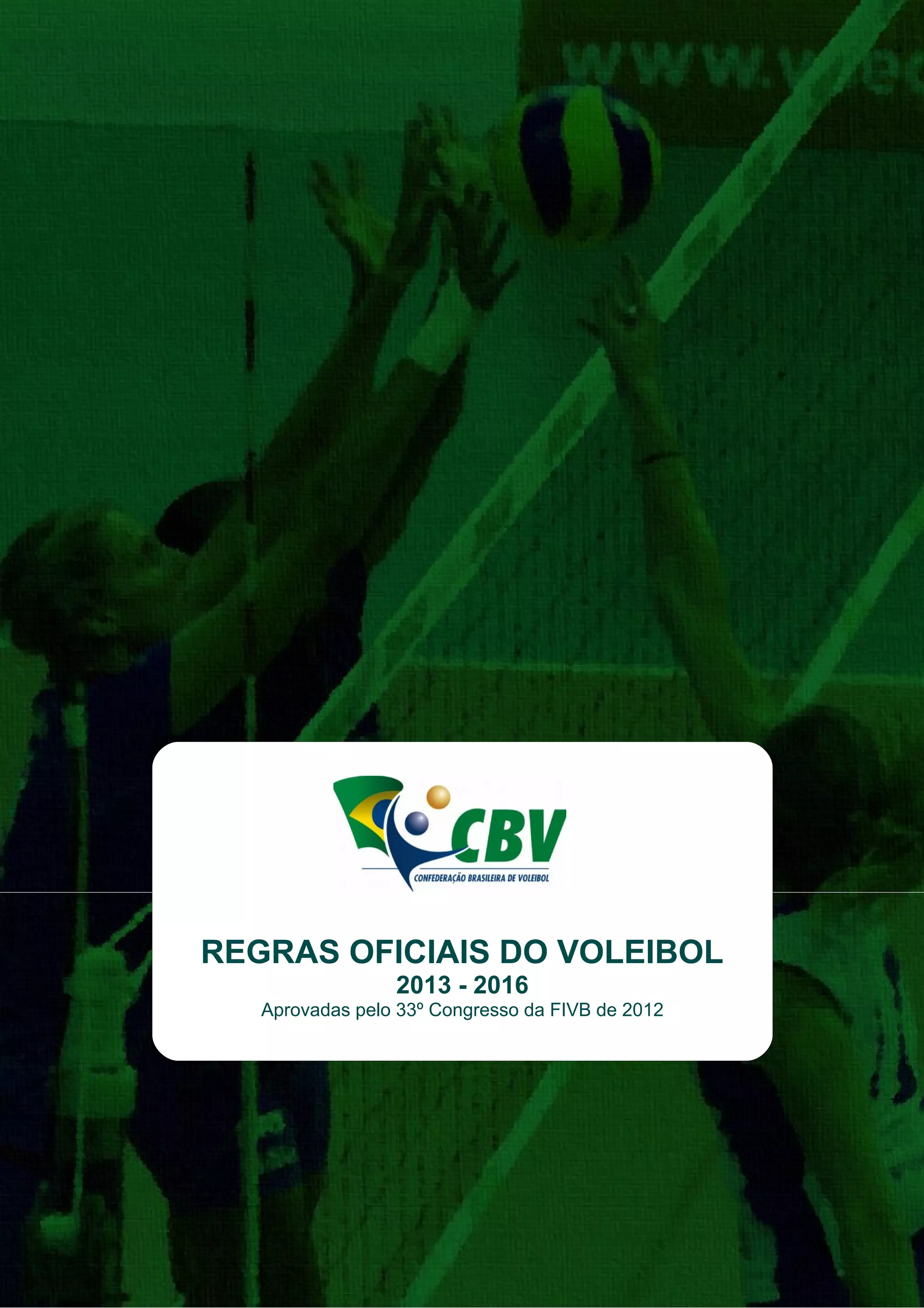 O documento apresenta as regras oficiais do voleibol para o período de 2013 a 2016. Ele descreve as características do jogo, a estrutura e equipamentos necessários, as ações e formato do jogo, papel dos participantes e árbitros, além de diagramas ilustrativos. O objetivo é tornar o voleibol um esporte justo, seguro e prazeroso para todos.