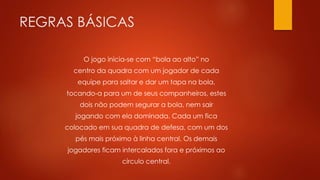Este documento resume as principais regras do basquete, incluindo: (1) como começa o jogo com "bola ao alto" no centro da quadra; (2) como marcar pontos ao lançar a bola na cesta; e (3) como definir as zonas de defesa e ataque de cada equipe.