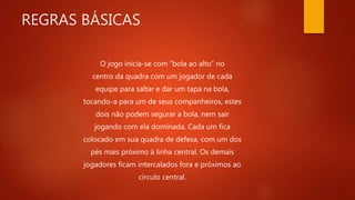 1) O jogo começa com um "bola ao alto" no centro da quadra e os jogadores devem passar ou driblar a bola para avançar.