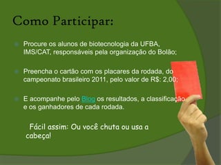 O documento descreve as regras de um bolão do Campeonato Brasileiro de 2011 organizado por alunos da UFBA. Os participantes pagam R$2 para preencher um cartão com seus palpites para os placares da rodada. O vencedor de cada rodada leva 50% da arrecadação e os pontos são somados para o prêmio final.