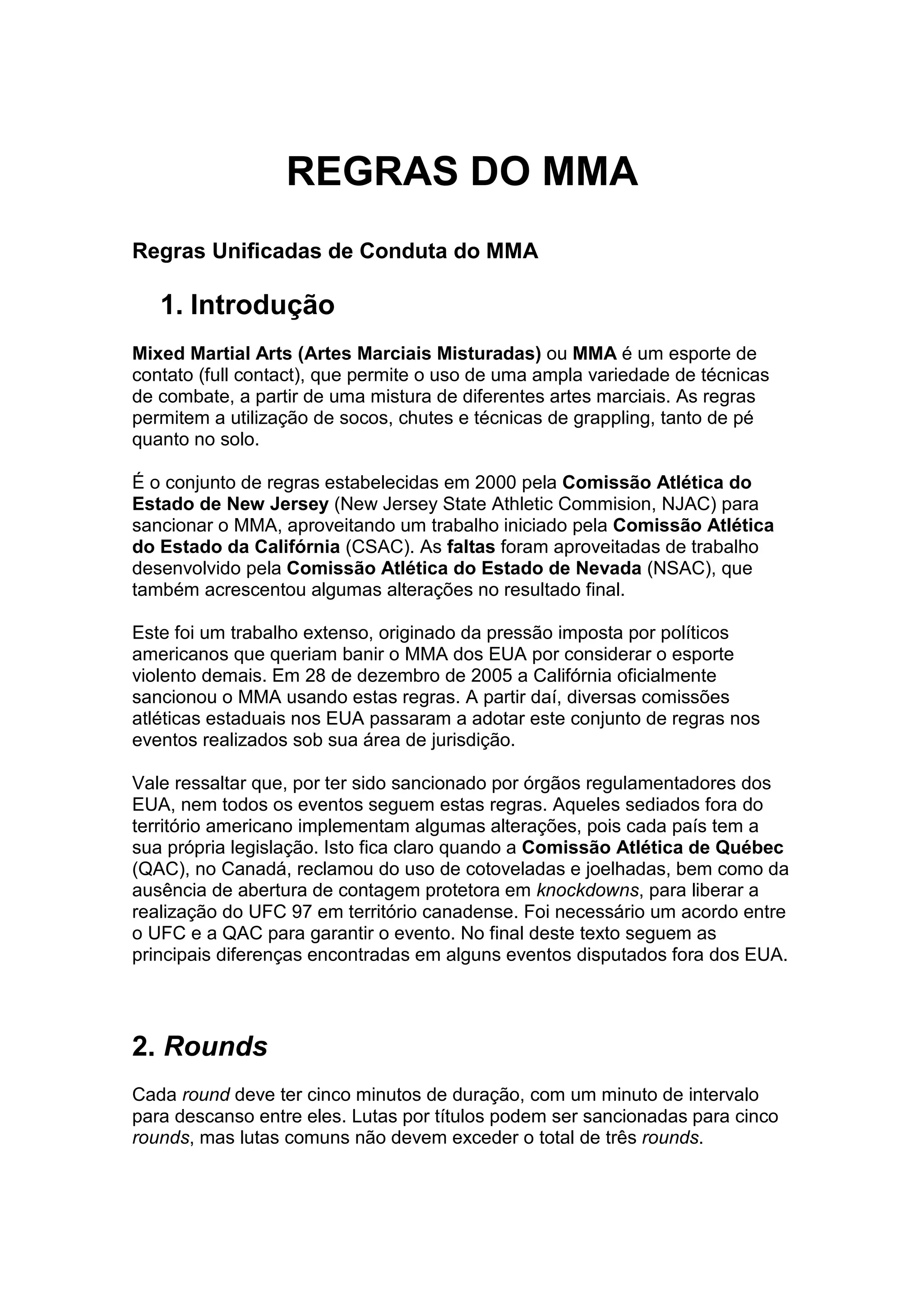 As regras unificadas do MMA estabelecem os requisitos para os rounds, equipamentos, técnicas permitidas e proibidas, arbitragem, resultados possíveis de uma luta e condutas gerais dos lutadores. São permitidos socos, chutes, quedas e finalizações, mas são proibidas cabeçadas, mordidas e ataques à região genital. As lutas são divididas em rounds de 5 minutos com intervalos de 1 minuto.