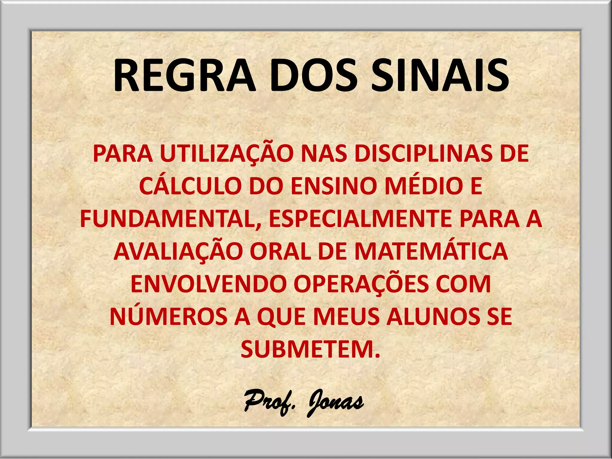 O documento apresenta a regra dos sinais para operações matemáticas, incluindo soma, subtração, multiplicação, divisão e potenciação, abordando casos com números positivos e negativos. Também discute propriedades do zero em operações matemáticas e a indeterminação em certos casos. Além disso, menciona um blog do autor que trata de diversos assuntos, incluindo matemática e experiências em escolas.