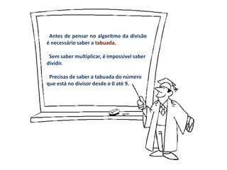 Este documento fornece instruções para realizar divisões, explicando os passos: 1) garantir que o dividendo tenha casas decimais iguais ou superiores ao divisor, 2) garantir que o dividendo seja maior ou igual ao divisor, 3) selecionar algarismos do dividendo para formar um número maior ou igual ao divisor e encontrar o quociente correspondente na tabuada, repetindo o processo com os restos até zerar.