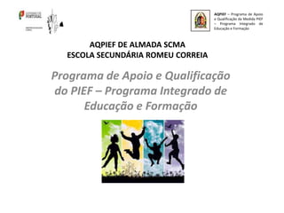 Este documento apresenta informações sobre o Programa de Apoio e Qualificação do PIEF (Programa Integrado de Educação e Formação) na Escola Secundária Romeu Correia em Almada. Inclui regras para os alunos, detalhes sobre a disciplina de Ciências Sociais e a definição de cidadão.