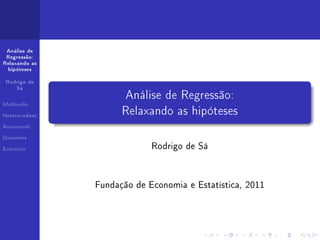 Este documento discute o relaxamento das hipóteses da regressão linear clássica, especificamente multicolinearidade, heterocedasticidade e autocorrelação. O autor analisa cada uma dessas violações das hipóteses e apresenta métodos para detectá-las e corrigi-las.