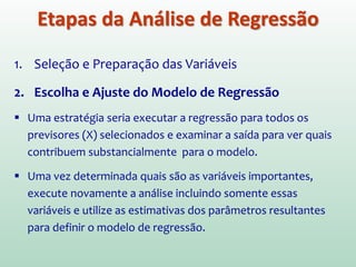 Este documento discute conceitos e métodos de análise de regressão linear. Ele explica o que é regressão simples e múltipla, como interpretar os coeficientes de regressão, e métodos para selecionar variáveis preditoras, como entrada forçada, hierárquica e passo a passo. Também aborda diagnósticos para identificar valores atípicos e casos influentes e a importância de validar se um modelo pode ser generalizado.