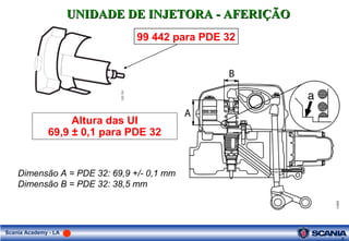 O documento fornece instruções sobre como ajustar as válvulas e unidades de injeção em um motor Scania de acordo com as marcações no volante do motor. Ele lista as posições angulares do volante onde cada cilindro entra em balanço e as correspondências entre os cilindros, ângulos do volante e posições das válvulas e unidades de injeção a serem ajustadas.