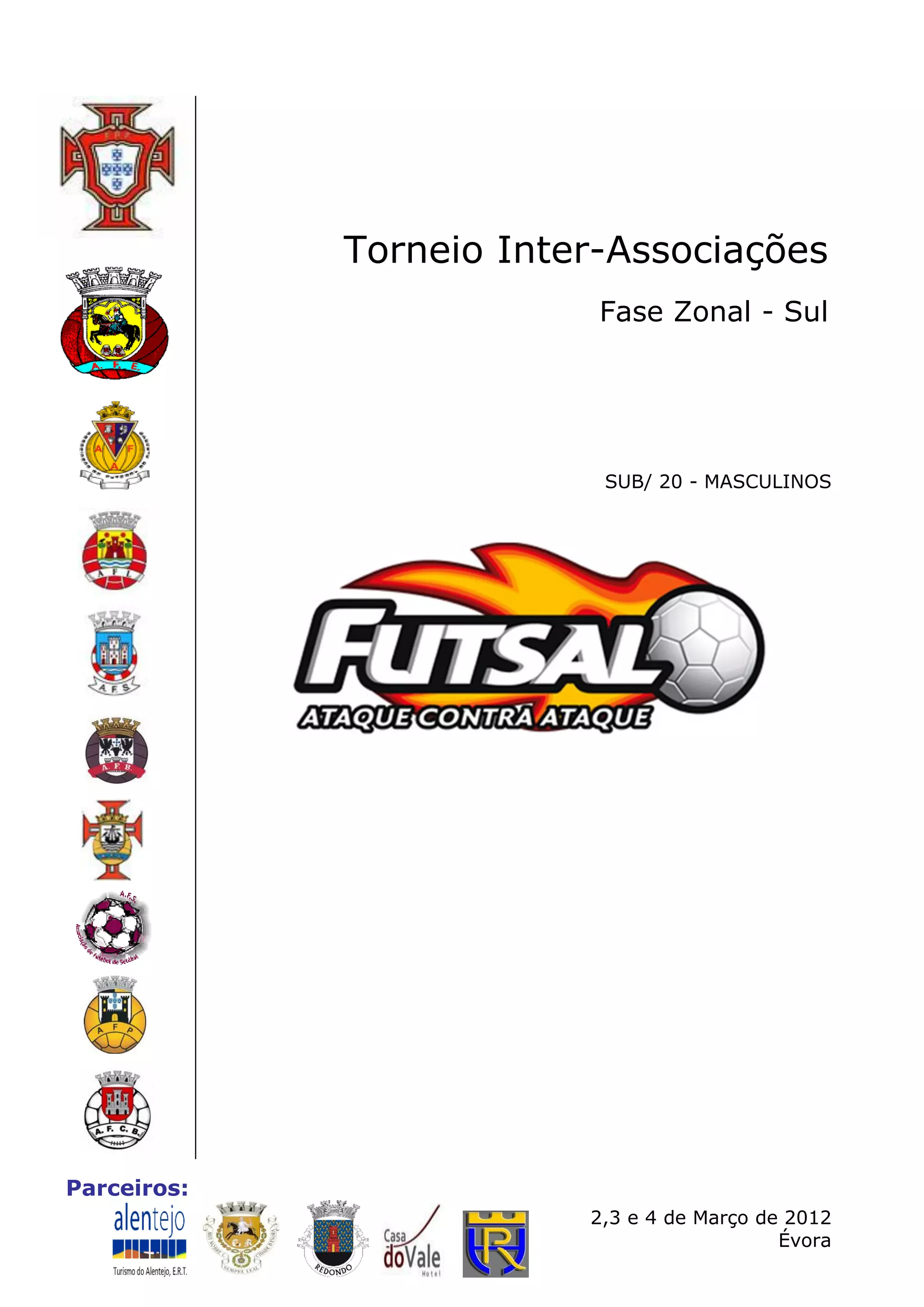1. Este documento apresenta o Torneio Inter-Associações de Futsal Masculino Sub-20 na zona sul de Portugal, que ocorrerá de 2 a 4 de março em Évora. 2. Participarão nove associações distritais e haverá jogos em três pavilhões da cidade. 3. O cronograma inclui detalhes sobre os jogos, refeições e reuniões durante o torneio.