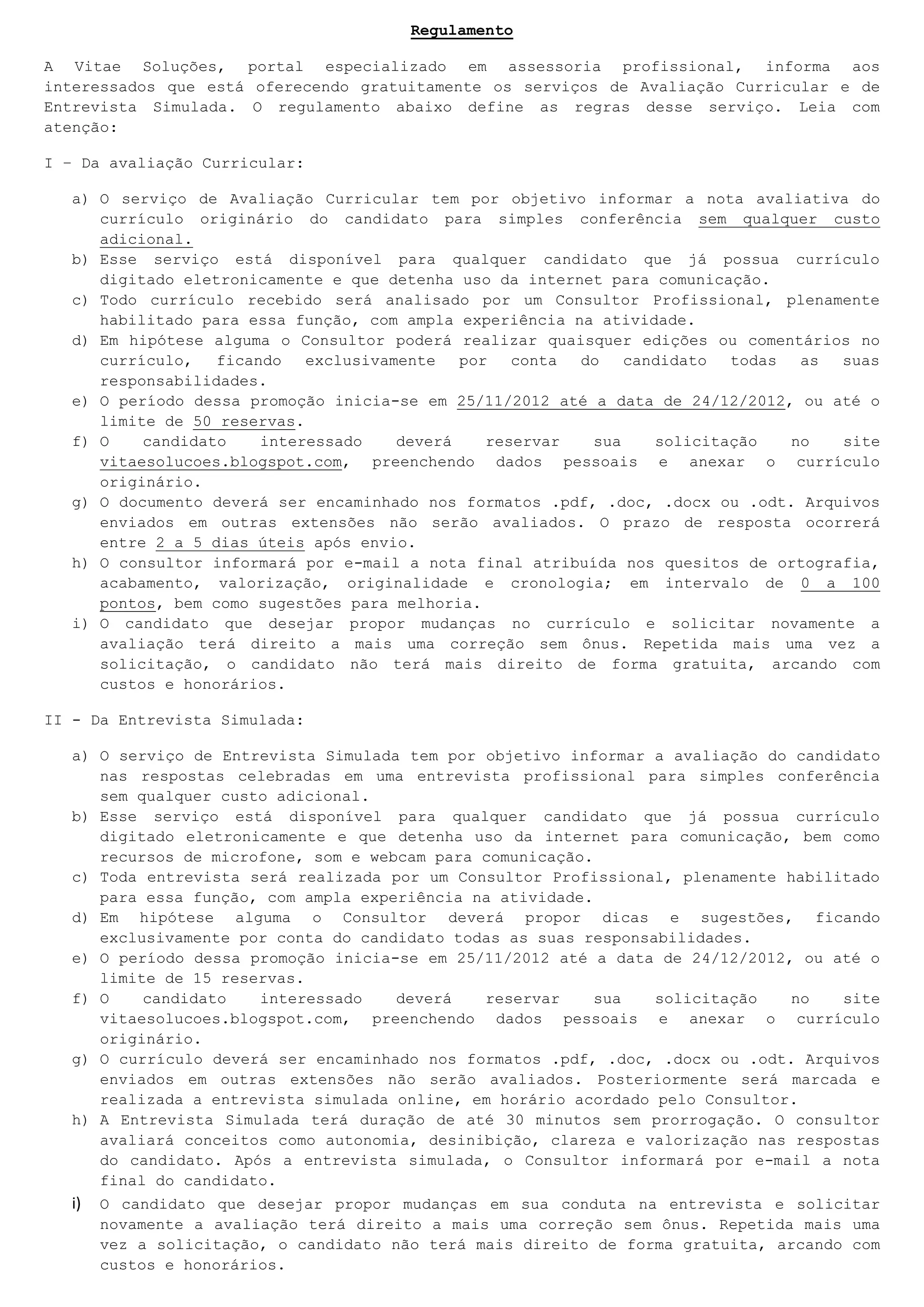 O documento descreve os serviços gratuitos de avaliação curricular e entrevista simulada oferecidos pelo portal Vitae Soluções, definindo as regras para cada serviço, como o prazo de 25 de novembro a 24 de dezembro de 2012, análise do currículo e entrevista por consultores experientes, e direito a uma reavaliação gratuita.