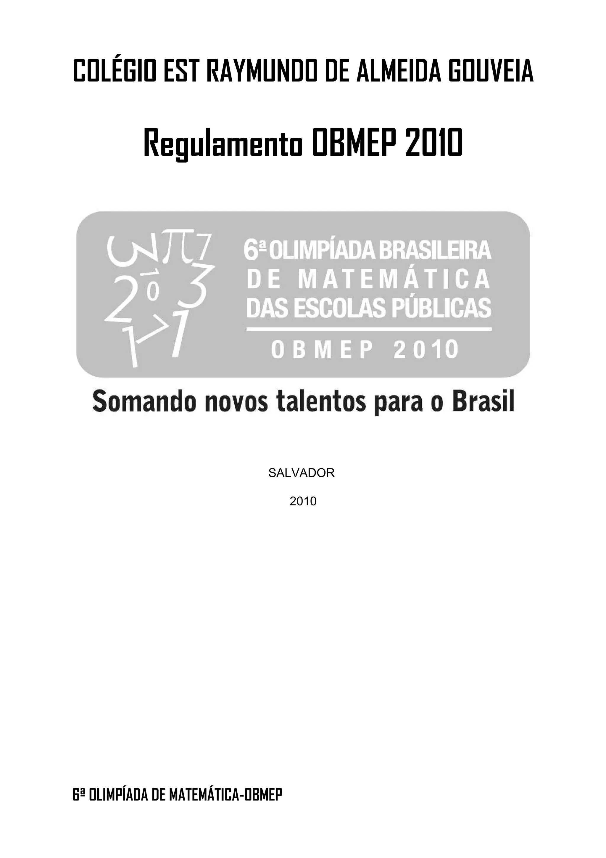 Este documento apresenta as diretrizes e regulamentos para a 6a Olimpíada Brasileira de Matemática das Escolas Públicas (OBMEP) no Colégio Estadual Raymundo de Almeida Gouveia. A OBMEP é um projeto nacional voltado para estimular o estudo da matemática entre alunos e professores de escolas públicas. O evento no colégio irá acontecer em duas etapas com provas objetivas e premiação dos melhores colocados.