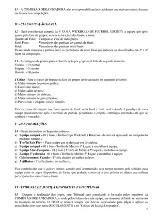 Este documento estabelece as regras para a 4a Copa Wickbold de Futebol Society. A competição é organizada para os funcionários e prestadores de serviço da empresa Wickbold e suas filiadas. As regras cobrem tópicos como participação, jogos, classificação, premiações, tribunal disciplinar e penalidades.