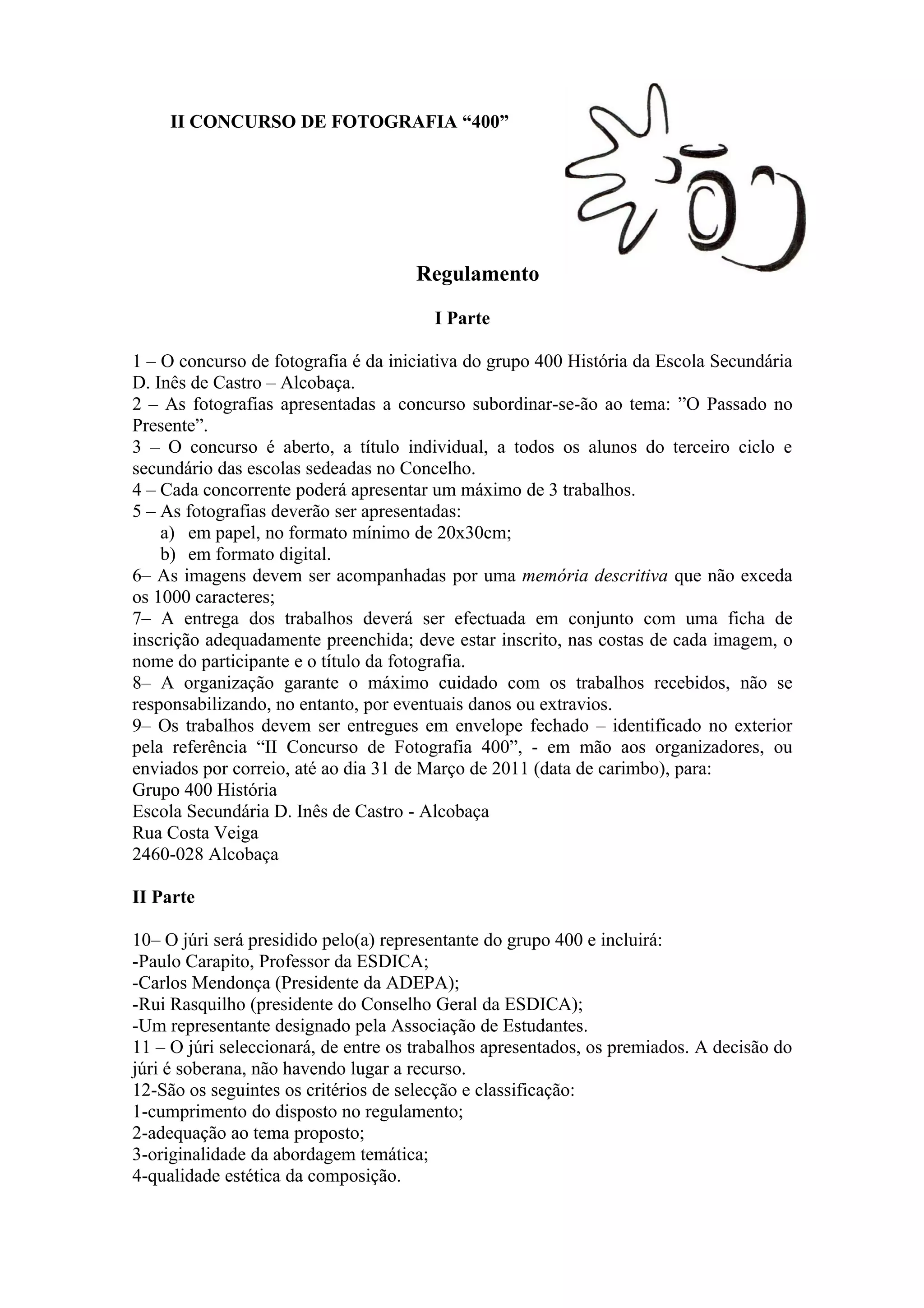 Este documento apresenta o regulamento do II Concurso de Fotografia "400" organizado pelo grupo 400 História da Escola Secundária D. Inês de Castro em Alcobaça. O concurso tem como tema "O Passado no Presente" e está aberto a alunos do concelho. Cada participante pode submeter até 3 fotos e os vencedores receberão prémios simbólicos decididos por um júri.