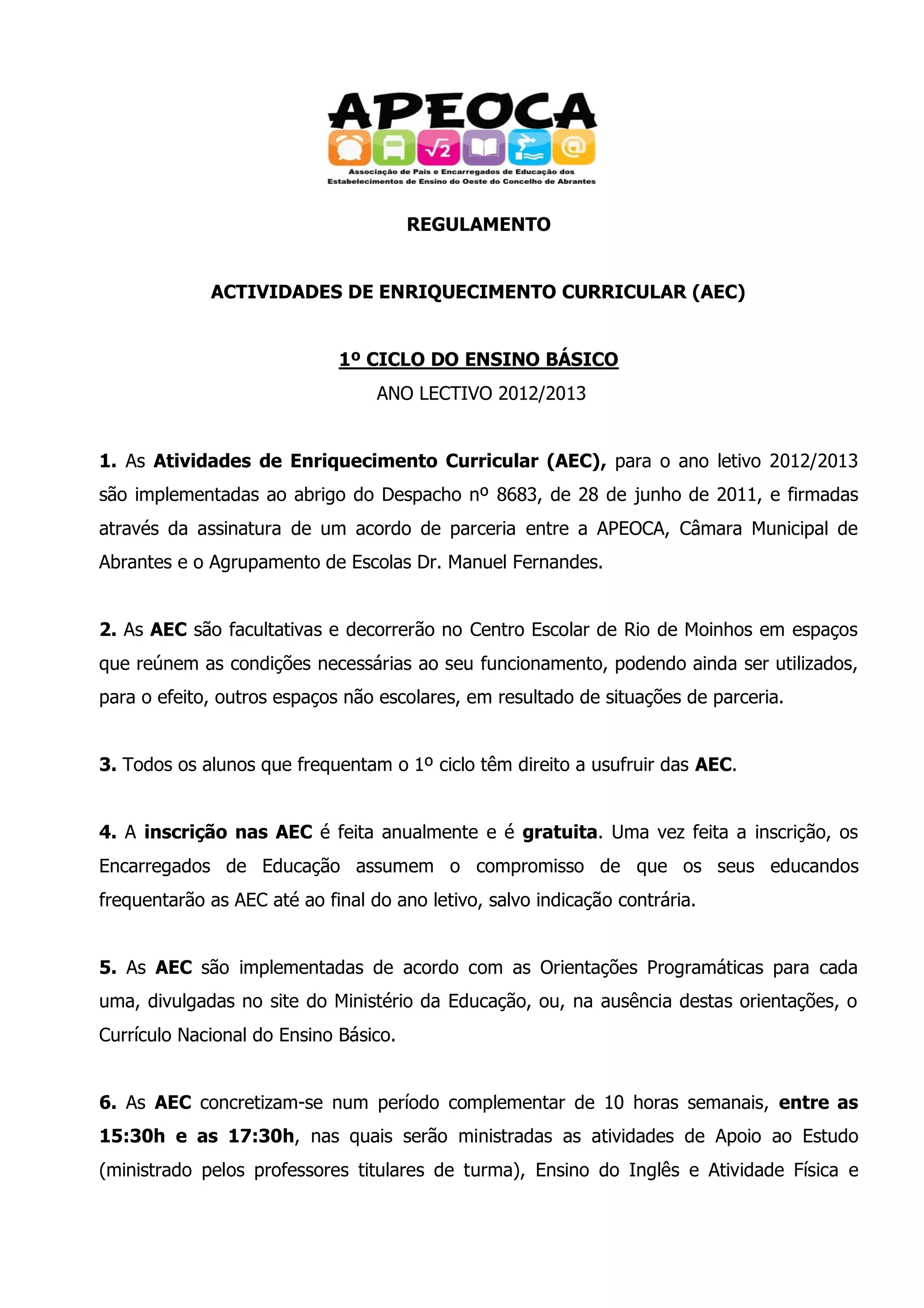 Este documento define as regras e regulamentos para as Atividades de Enriquecimento Curricular (AEC) e para o Centro de Atividades de Tempos Livres (CAF/ATL) para o 1o ciclo no Agrupamento de Escolas Dr. Manuel Fernandes. As AEC são atividades extracurriculares opcionais após o horário escolar e incluem apoio ao estudo, inglês, atividades físicas e lúdico-expressivas. O CAF/ATL oferece acolhimento de manhã e prolongamento à tarde para os alunos
