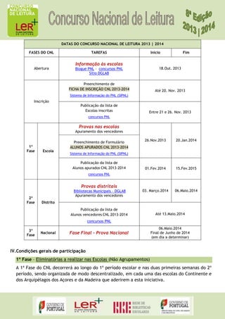I. O Concurso Nacional de Leitura 2013-2014 decorre entre Outubro de 2013 e Junho de 2014, com o objetivo de promover o prazer de ler entre alunos do 3o Ciclo e Secundário.