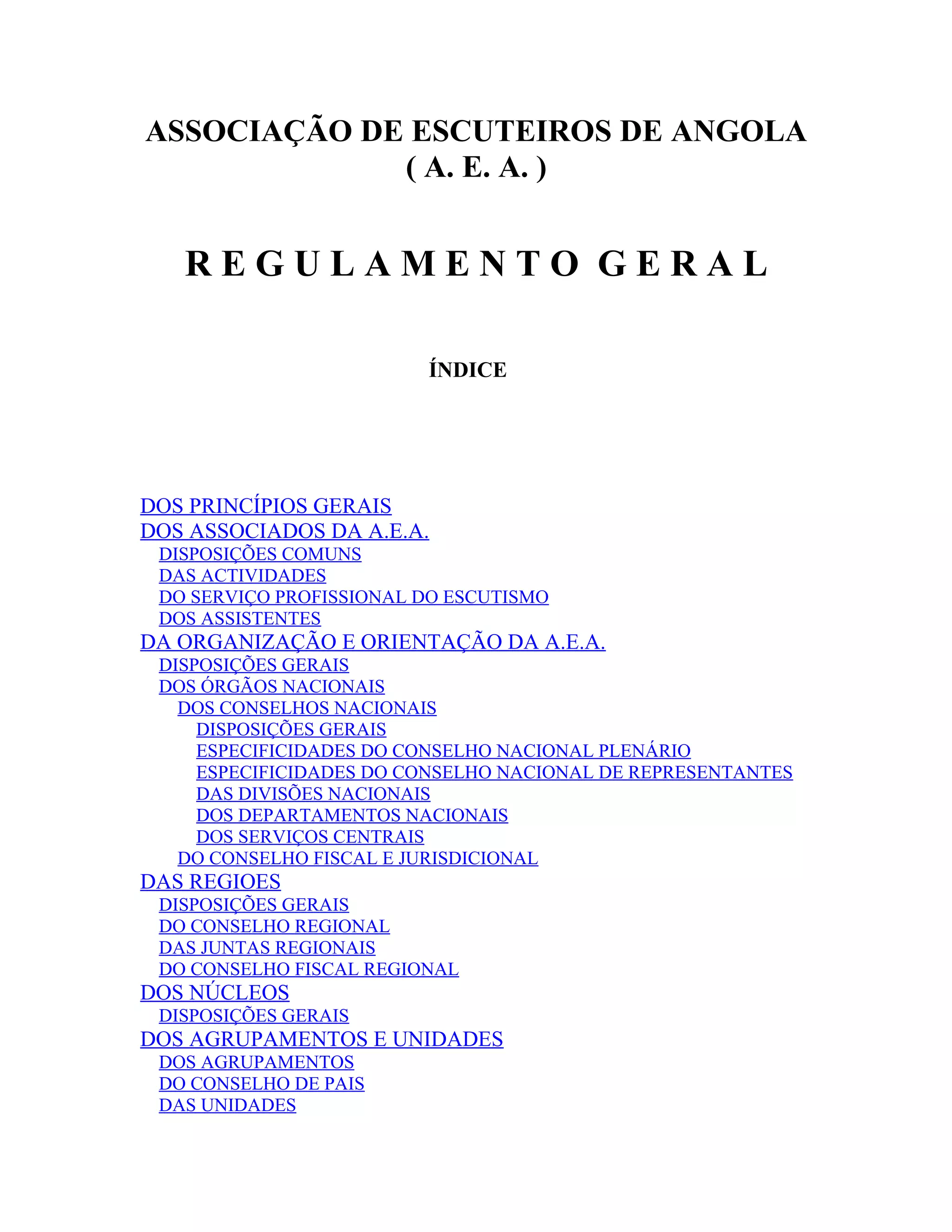 Este documento apresenta os princípios gerais da Associação de Escuteiros de Angola (AEA), incluindo seus objetivos, membros, atividades, organização e administração financeira. Detalha a estrutura da organização, com diferentes níveis como regiões, núcleos e agrupamentos, além de definir a lei, promessa e símbolos dos escuteiros. Estabelece também as publicações oficiais da AEA e diretrizes para boletins regionais.