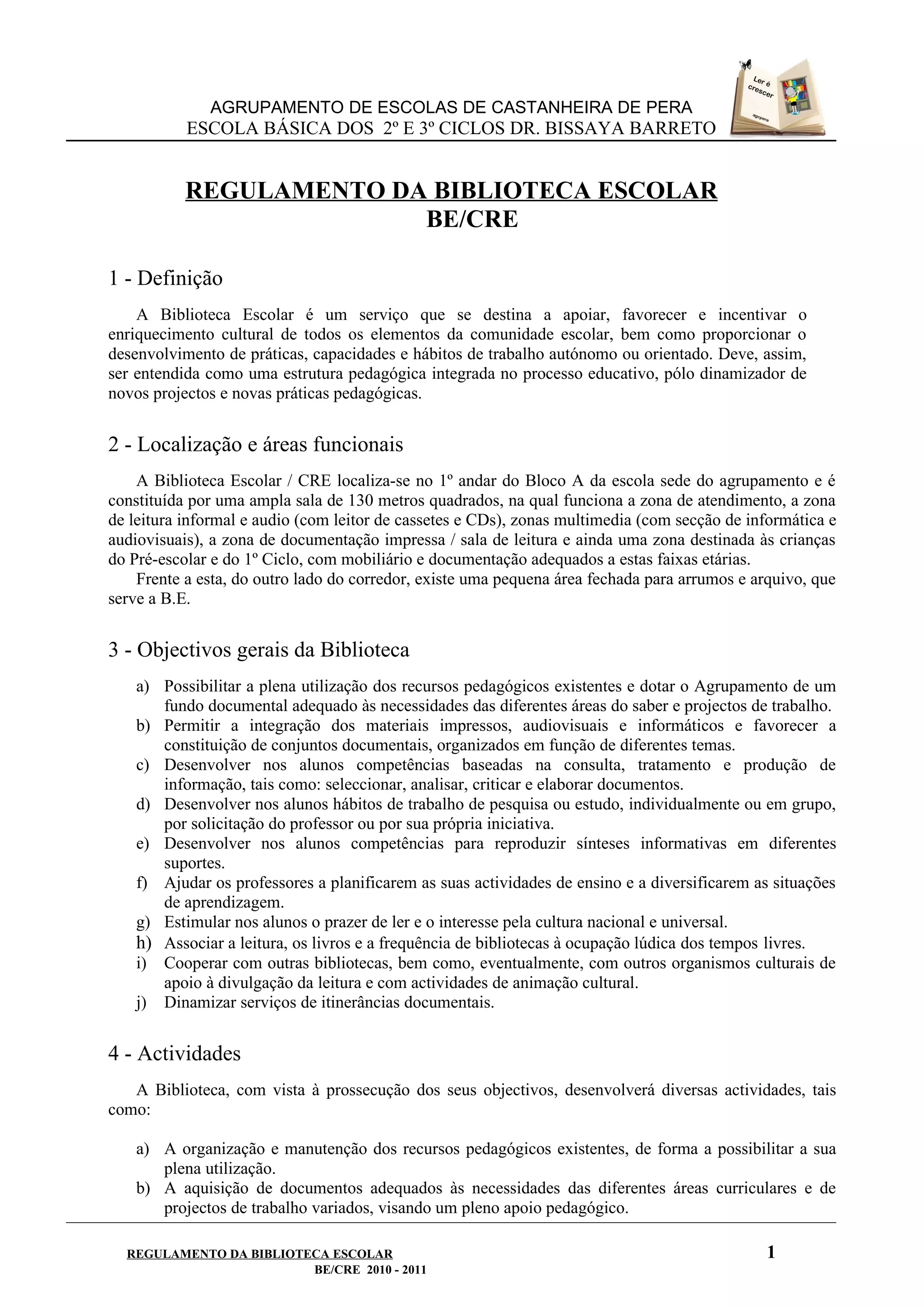 Este documento descreve o regulamento da biblioteca escolar da Escola Básica dos 2o e 3o Ciclos Dr. Bissaya Barreto. Ele define os objetivos, localização, atividades, horários, utilizadores, direitos e deveres dos utilizadores, regras de conduta e empréstimos da biblioteca.