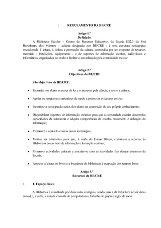 Este documento apresenta o regulamento da Biblioteca Escolar - Centro de Recursos Educativos da Escola EB2,3 da Frei Bartolomeu dos Mártires. Define os objetivos, recursos, funcionamento, utilização do fundo documental, penalizações e direitos e deveres dos utilizadores da biblioteca.